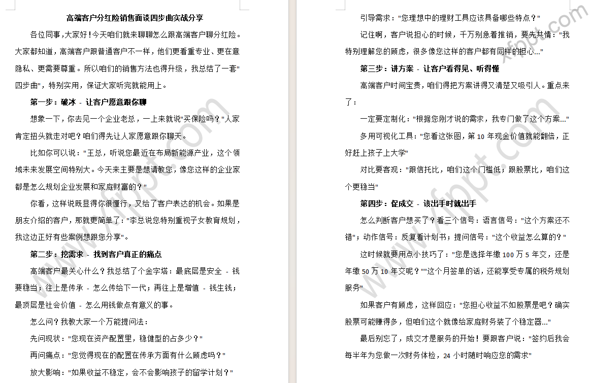 高端客户分红险销售面谈四步曲实战技巧32页(含演讲稿) 2025-08-10 理财险 482 感谢【嘿嘿】共享。如有侵权,请提供对应版版权作品登记材料,联系本站删除。 资源下载下载价格一年VIP专享仅限一年VIP下载升级一年VIP请先登录支持手机及电脑端下载 0