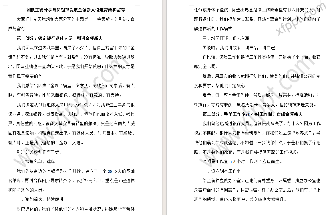 团队主管分享金领新人引进育成和留存34页(含演讲稿) 3周前 增员 54 感谢【Allen】共享。如有侵权,请提供对应版版权作品登记材料,联系本站删除。 资源下载下载价格一年VIP专享仅限一年VIP下载升级一年VIP请先登录支持手机及电脑端下载 0