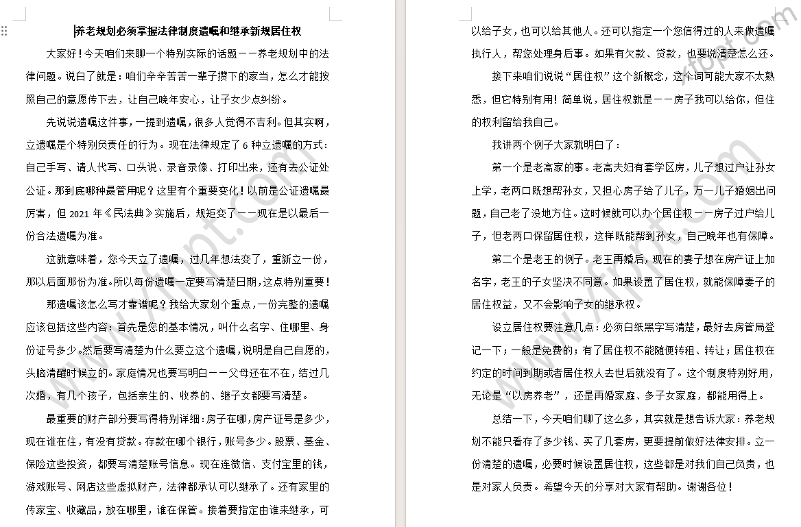 养老规划法律制度遗嘱和继承新规居住权21页(含演讲稿) 3周前 行业资讯 38 感谢【芸芸】共享。如有侵权,请提供对应版版权作品登记材料,联系本站删除。 资源下载下载价格一年VIP专享仅限一年VIP下载升级一年VIP请先登录支持手机及电脑端下载 0